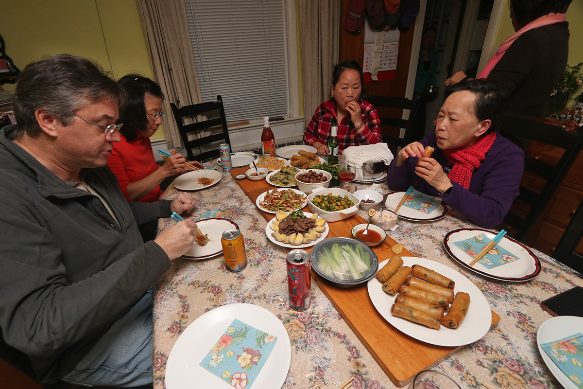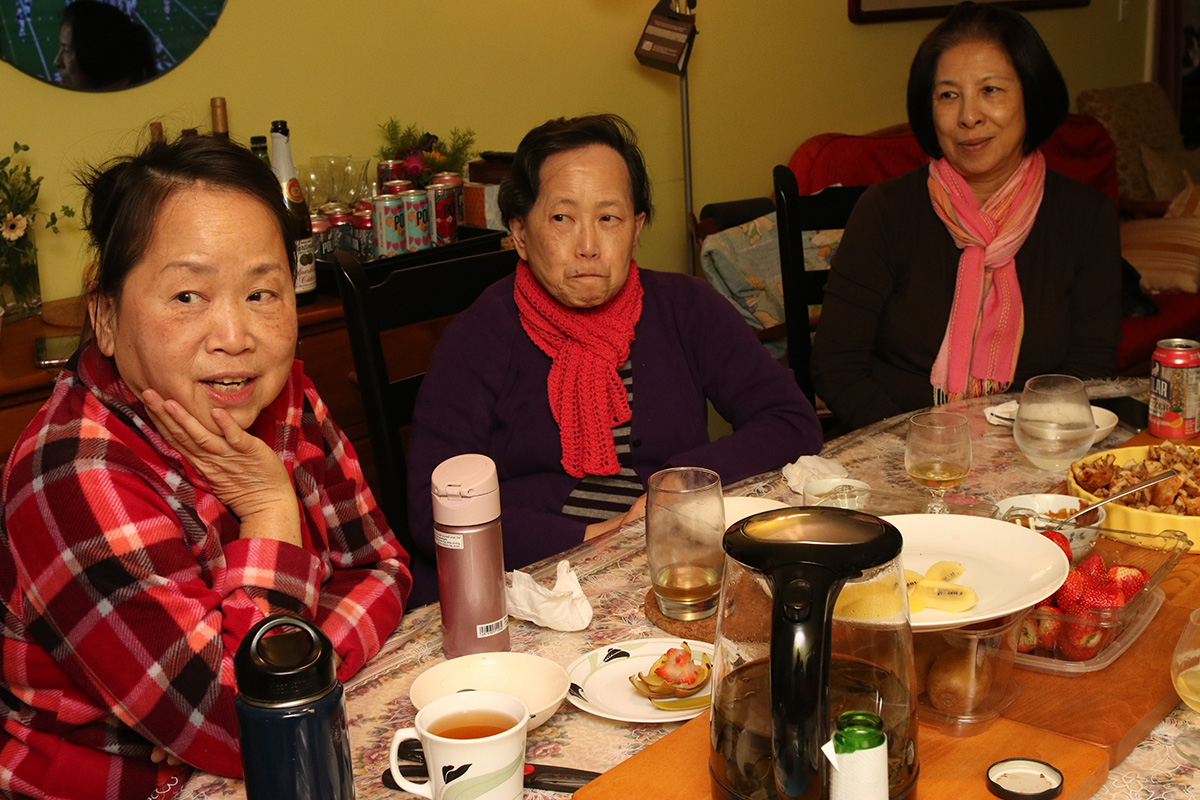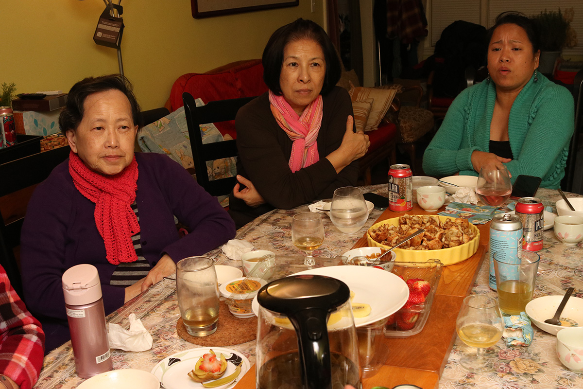 guests wouldn't arrive this year until 5pm, although typically my 2nd aunt and sister's godmother arrive earlier since my sister's their ride. in the afternoon we realized we were missing a few essential ingredients: white wine for the mussels, corn starch for the shrimps, and thai sweet chili sauce for the fried spring rolls. other than the wine, everything was available at the cafe. so at 2:30pm i left the house and went back home to grab my wine and corn starch and old chili sauce, then went to the cafe to pick up my 2nd aunt. my sister was supposed to do that, but she said she had to pick up her godmother and couldn't do both, so i was given that task. my 2nd aunt was making a glass noodle salad and a sweet ximilu (西米露) soup. she managed to scorch the bottom of the soup but decided to serve it anyway, rationalizing to herself that it was too badly burnt. we got back to belmont around 3pm.
