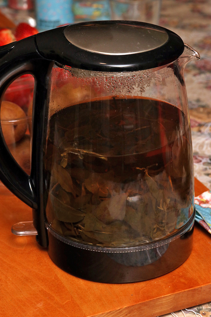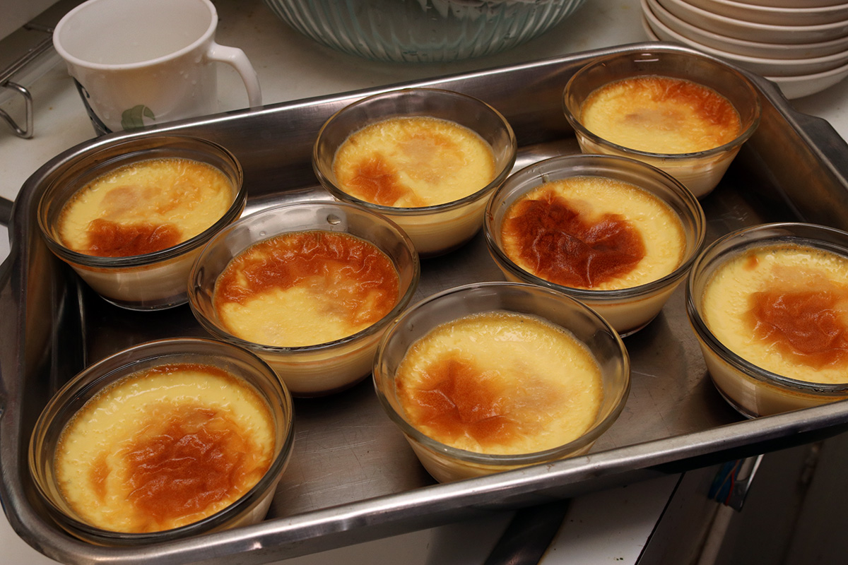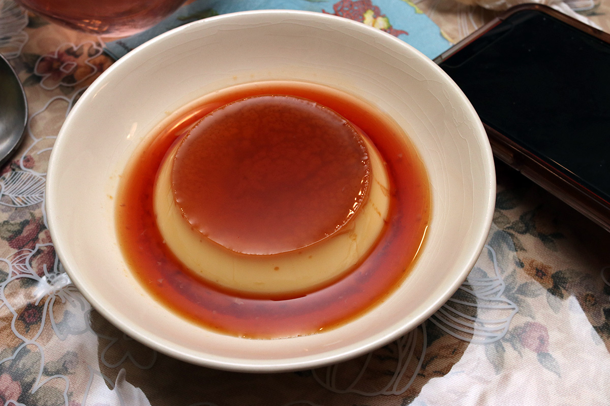 after we finished eating, the table was cleared for tea and dessert. my aunt had brought some kiwis and strawberries. i carved out 8 flan from ramekins and served them from tea trays. flan this year was good, barely any bubbles. i also tried some sweet ximilu soup; it was good, but you couldn't mask the burnt flavor.