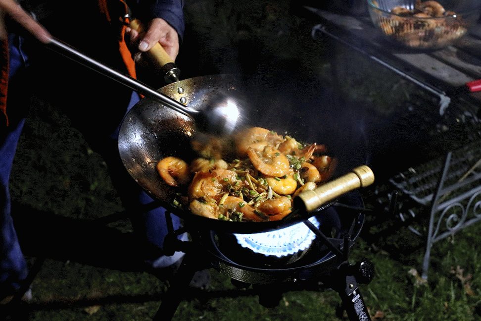 the shrimps were prepared outside on the wok burner. we moved the station closer to the house for more light but also for people to look outside from the window. i was outside helping, but my aunt and uncle came out onto the steps just to get a closer view. we seemed to have more shrimp than could easily fit inside the wok. after my father fried them all (coated in corn starch this time), he stir-fried them again in 2 batches.