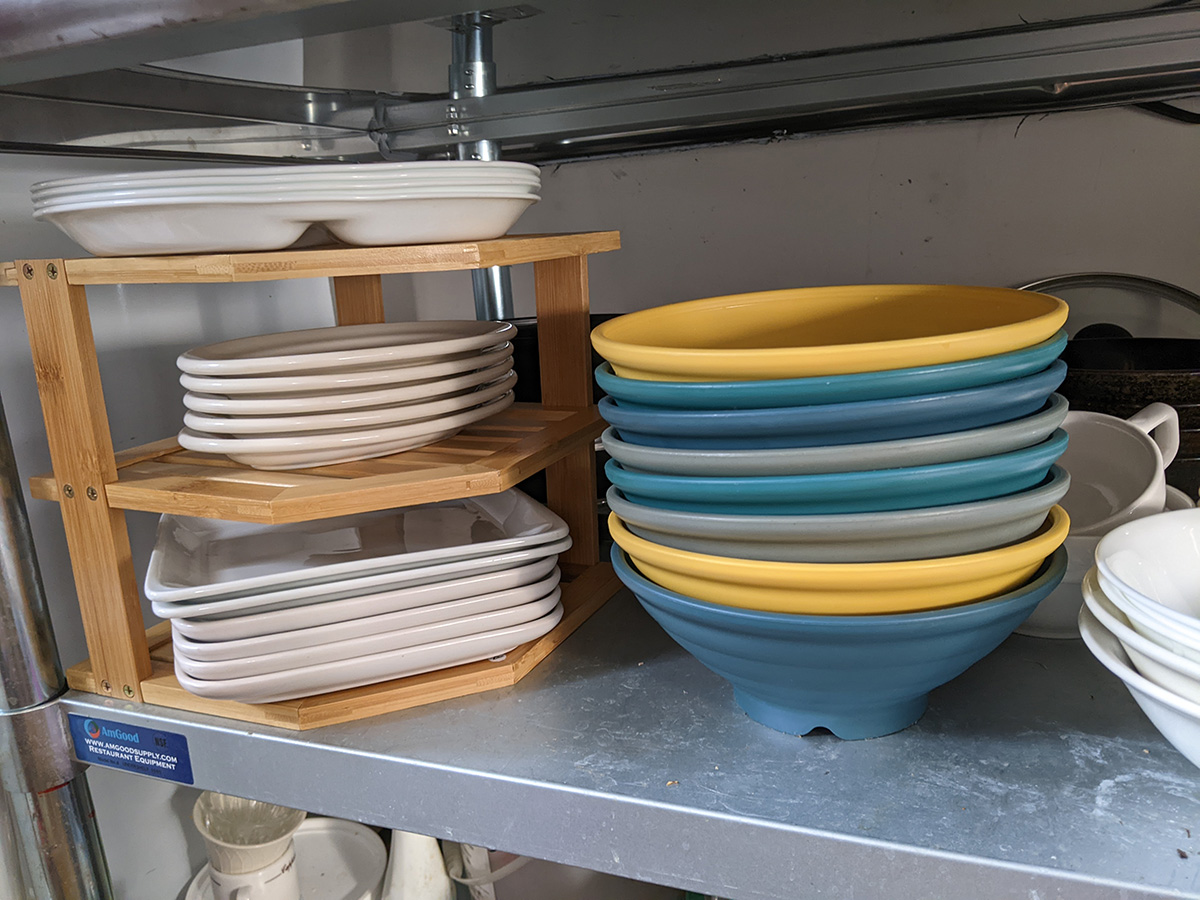 my bamboo corner plate organizer arrived and i assembled it when i first got in. now instead of the different plates stacked haphazardly on top of each other, there's a 3-tiered organized shelf.