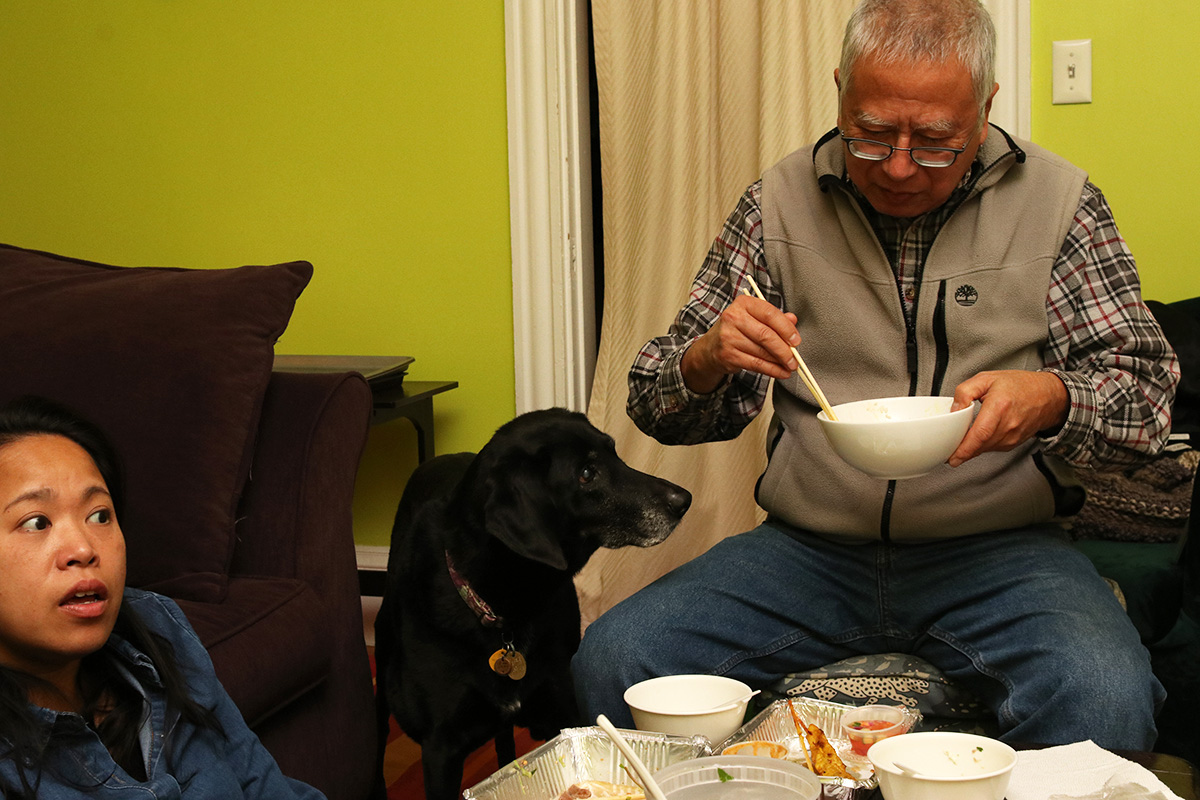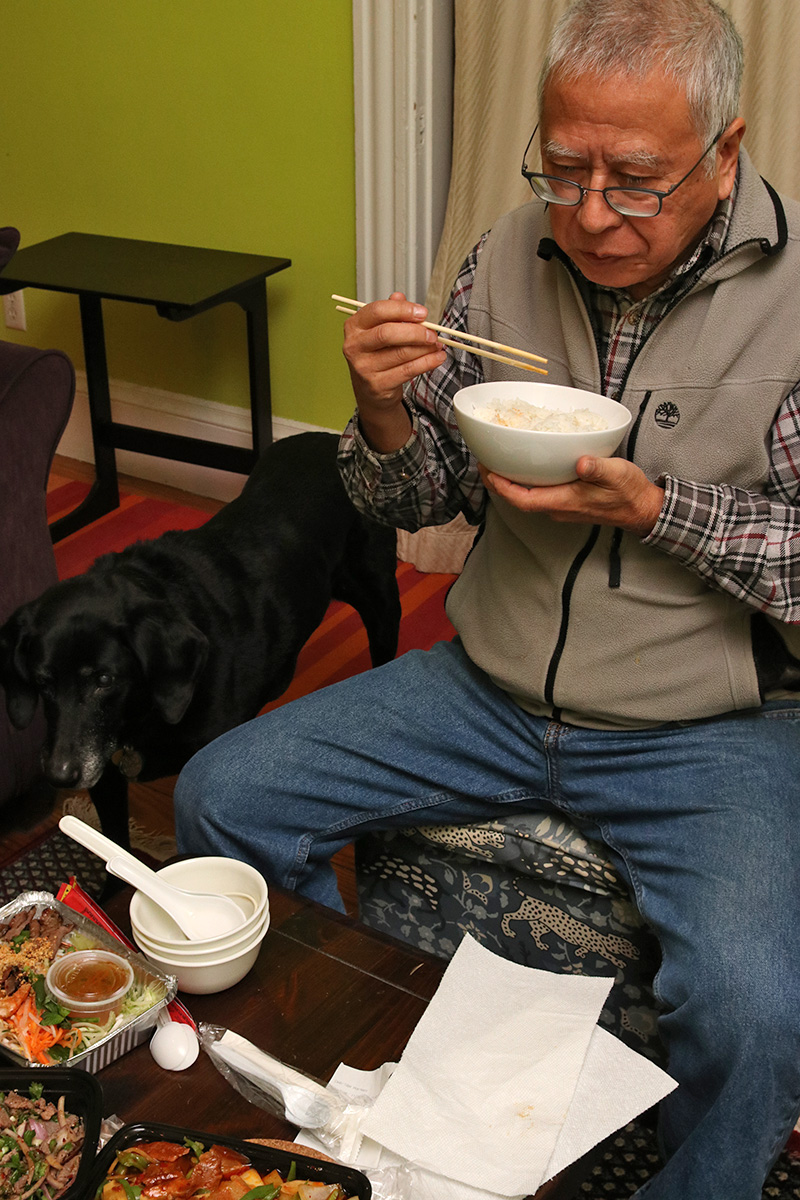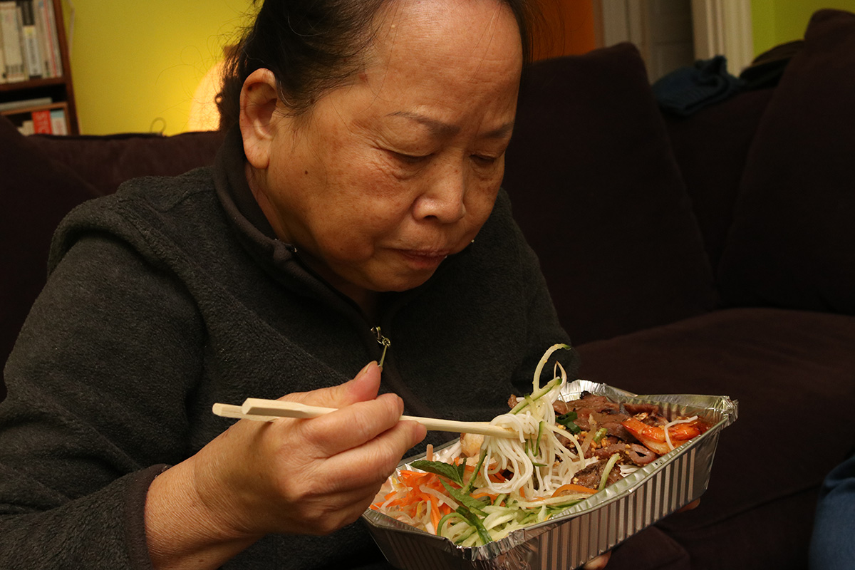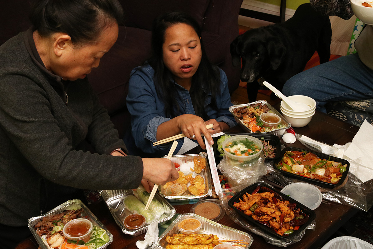 my sister had a birthday dinner at my place last year, where we just got takeouts from the nearby chinese and thai/vietnamese restaurants, so we basically did the same thing, nearly ordering the same dishes as well. my parents arrived first, followed by my sister and her dog. hailey wasn't able to get up the steps on her own so my sister had to carry her. my mother called zoe's to order some chinese dishes, they said there was a 30 minute wait. my father and i then walked down to pho & rice and ordered and paid in person (15-20 minute wait), before going to star market to pick up some more boneless chicken thighs on sale. my father ended up waiting for our orders as i returned home with the raw chicken. i went out later to help him carry the food back. the vietnamese/thai place had our food ready first, followed by our chinese food.