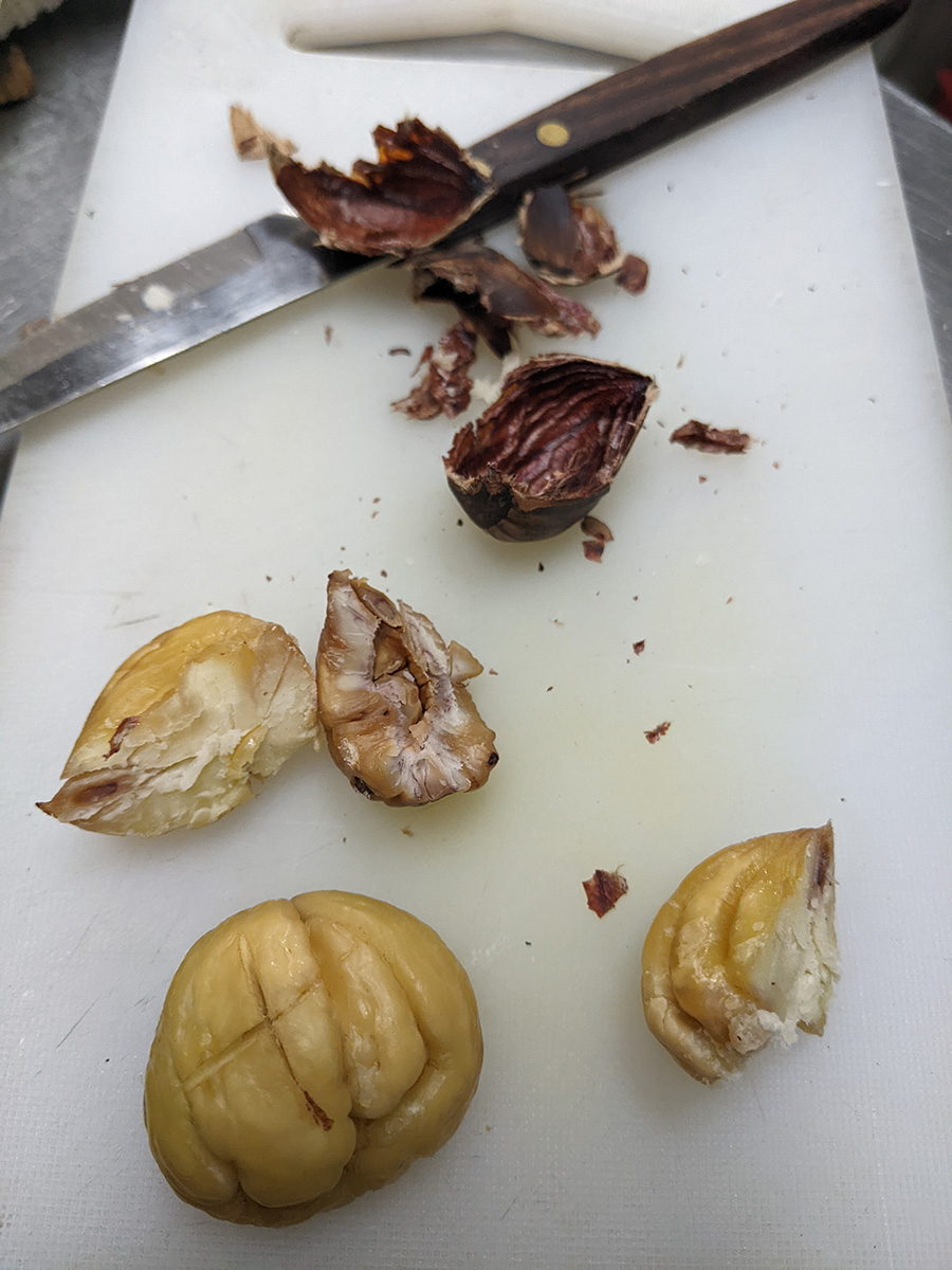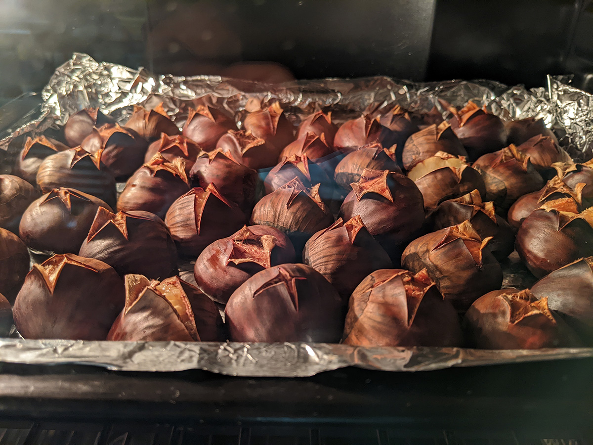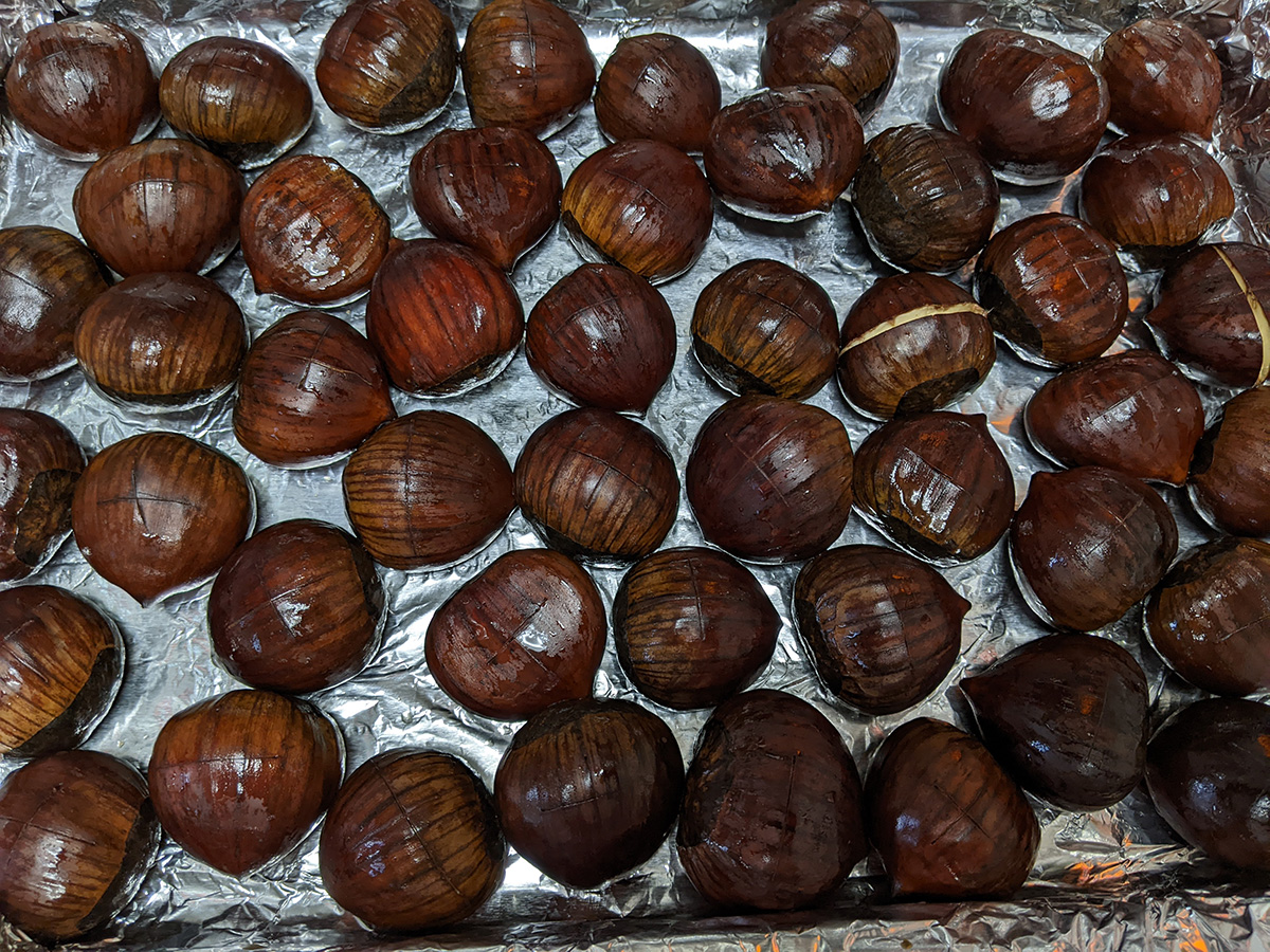 in the late afternoon i roasted the 2 lbs. of italian chestnuts i got from market basket yesterday. we first cut crosses into them before soaking in a salt water bath for 2 hours. i then roasted them in the oven for 25 minutes at 425°F. these were better quality than the chestnuts i bought from haymarket a few weeks ago,