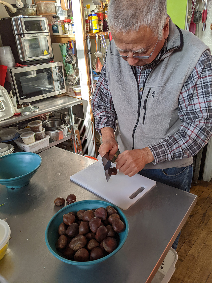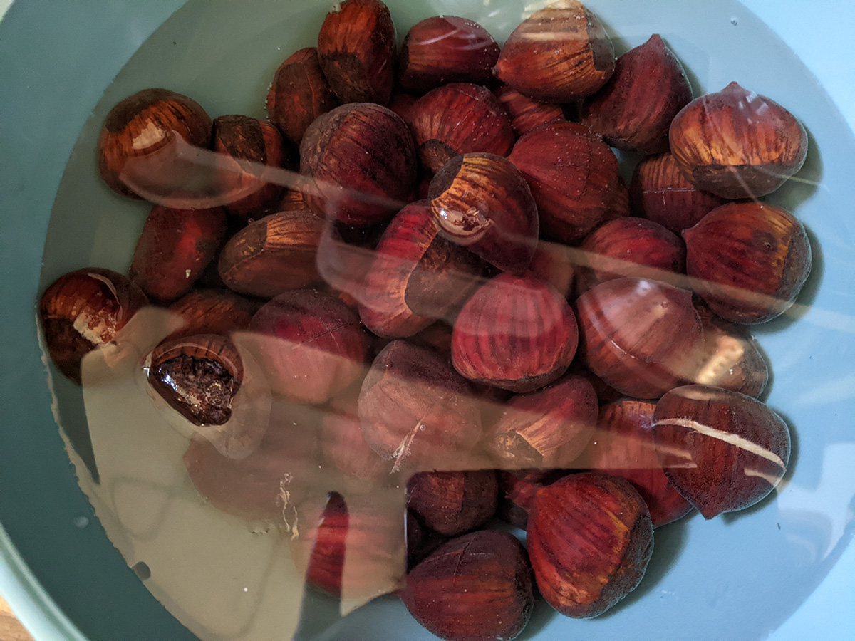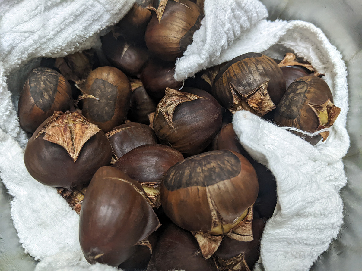 in the late afternoon i roasted the 2 lbs. of italian chestnuts i got from market basket yesterday. we first cut crosses into them before soaking in a salt water bath for 2 hours. i then roasted them in the oven for 25 minutes at 425°F. these were better quality than the chestnuts i bought from haymarket a few weeks ago,