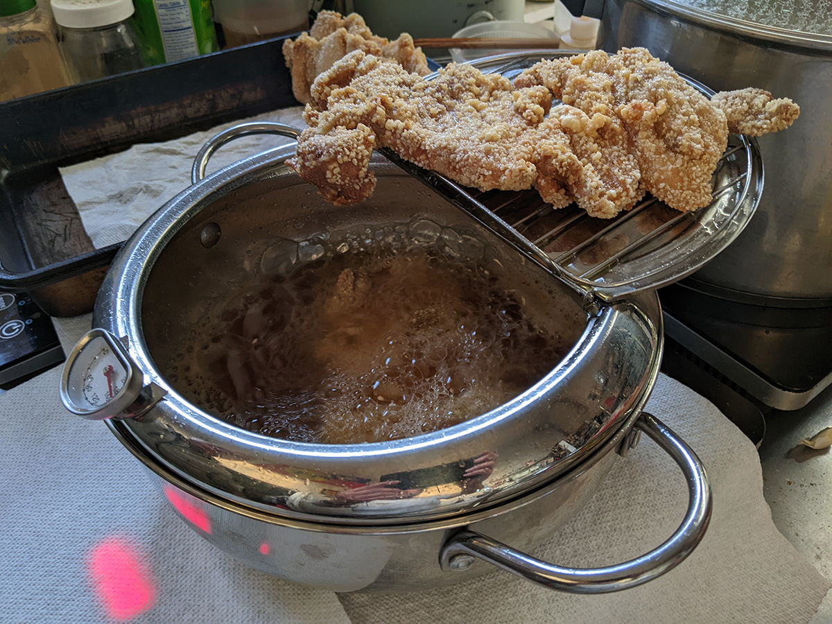 it was busy up until the afternoon, where we hardly saw any customers. by the end of the day we sold at least 13 bento boxes. we ran out of chicken and i had to make a supply run at the porter square star market to get some boneless chicken thighs. my father late filleted the chicken and fried them with breading.