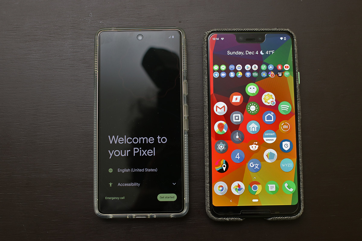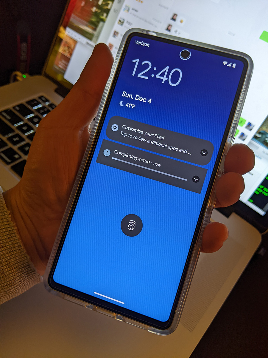 i wanted to put on the tempered glass screen protector before doing the transfer. i did it first with the pixel 3XL, replaced the previous protector that already had several cracks. even though the pixel 3XL would be retired, i wanted it to keep it in good shape. i also replaced the screen protector - from the simple black rubber case to a fabric google-brand case i'd bought earlier but changed out because of the pandemic (thinking the fabric case would be a germ magnet and harder to clean). i'm awful with screen protectors, and i ended up trapping some dust underneath the glass which i had to clean up with the sticky tape but removing the protector but that only introduced more dust. the final result was probably 98% clean, with a tiny amount of trapped air pockets around the edges of the protector.