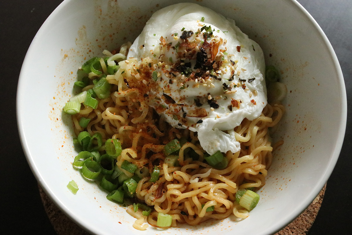 in the early afternoon i made some indomie mi goreng for lunch with a poached egg.