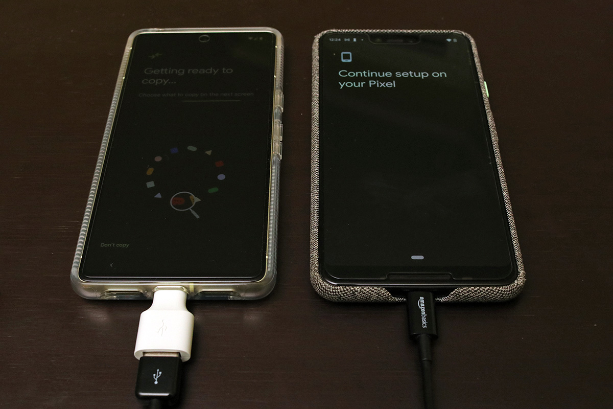 when i finally turned on the 7, it was even more obvious that it was taller and skinnier, but not something i'd notice if i didn't have the two phones side-by-side. both screens are listed as 6.3". because the 7 just had a dot for the forward-facing camera and not a whole notch like the 3XL, there was more screen real estate. the dot is very discreet and i almost don't notice it. the new phone asked me if i wanted to copy over my old data, and i said sure. it then instructed me to use the usb-c to usb-a adapter to connect the two phones together. i'd never done a phone-to-phone transfer like this before. when it asked me to confirm the transfer, i cancelled it because i just wanted to test the phone.