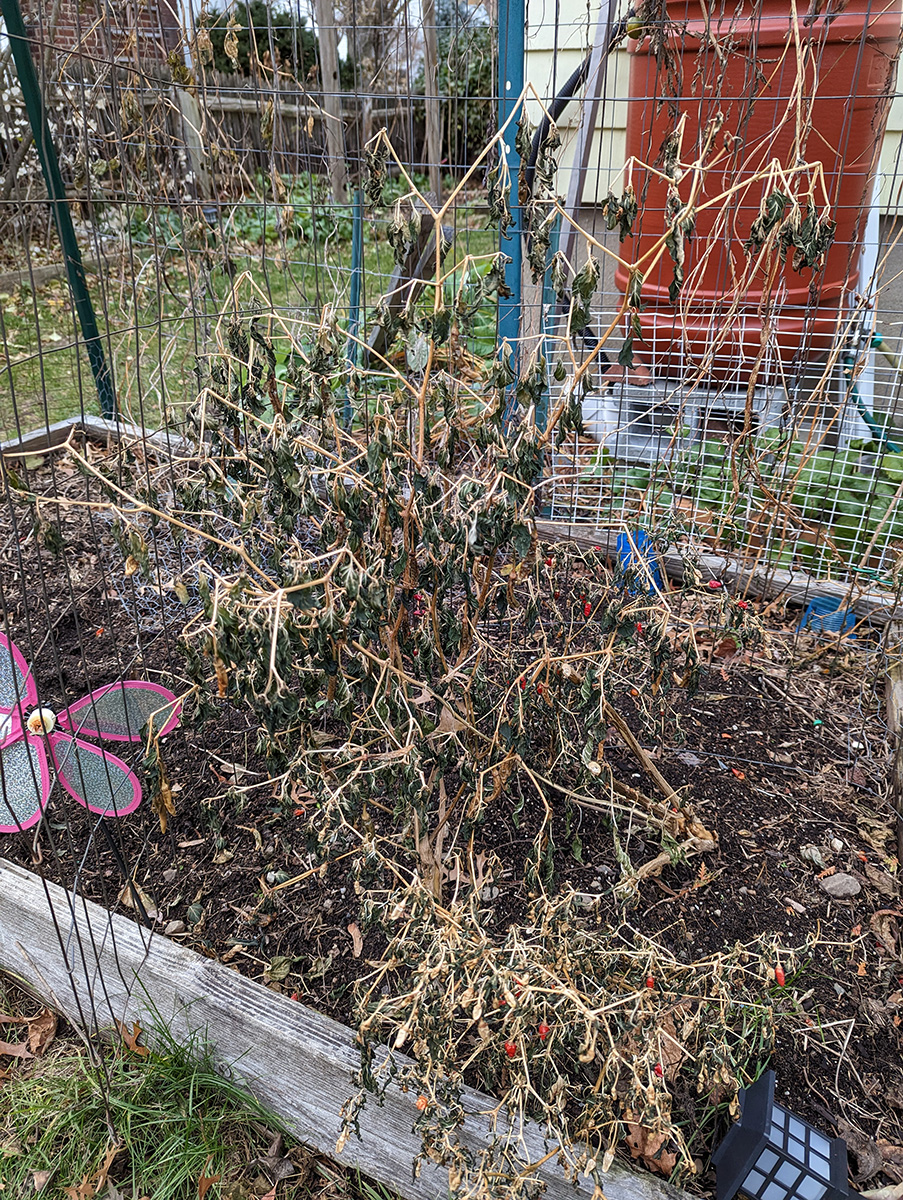 so while my father cleaned up the garage (it was so cluttered we could barely walk inside), i mowed the last of the leaves on the lawn using the mulch setting, because belmont stopped picking up garden refuse in our area in late november. i then went into the backyard and cleaned out the raised beds. belmont might not pick up our garden trash, but cambridge still will until the end of december (perhaps even longer), so we can just haul the garden refuse to my sister's place. i pulled up all the dead plants (nasturtiums, hot peppers), trimmed the perennials (rudbeckias), and tilled the spots where i want to plant my garlic bulbs. i didn't have time to do it today, i'm hoping i can get to it tomorrow.