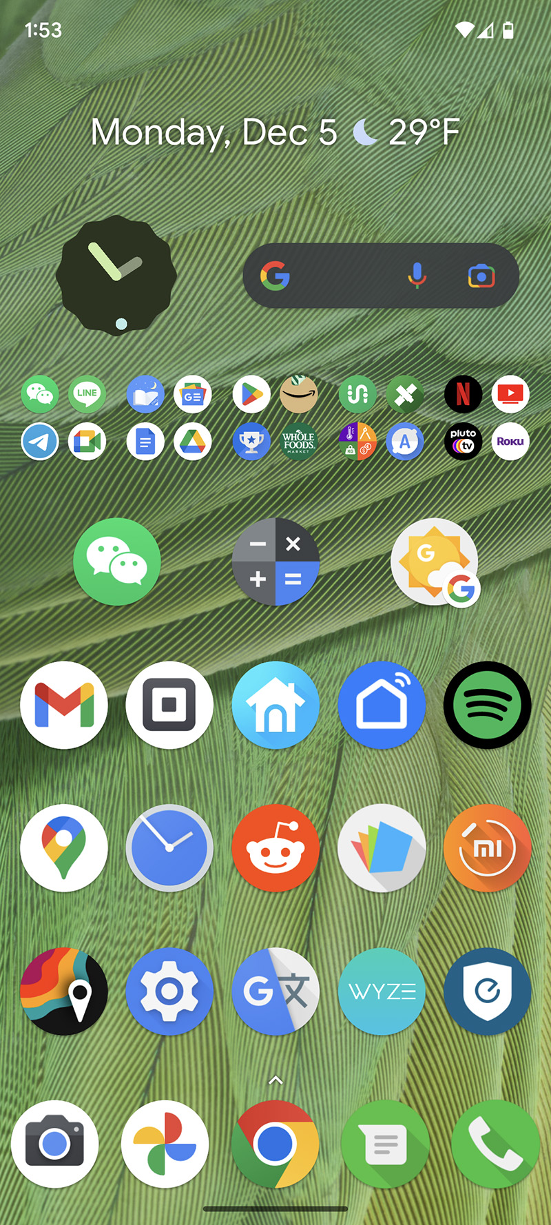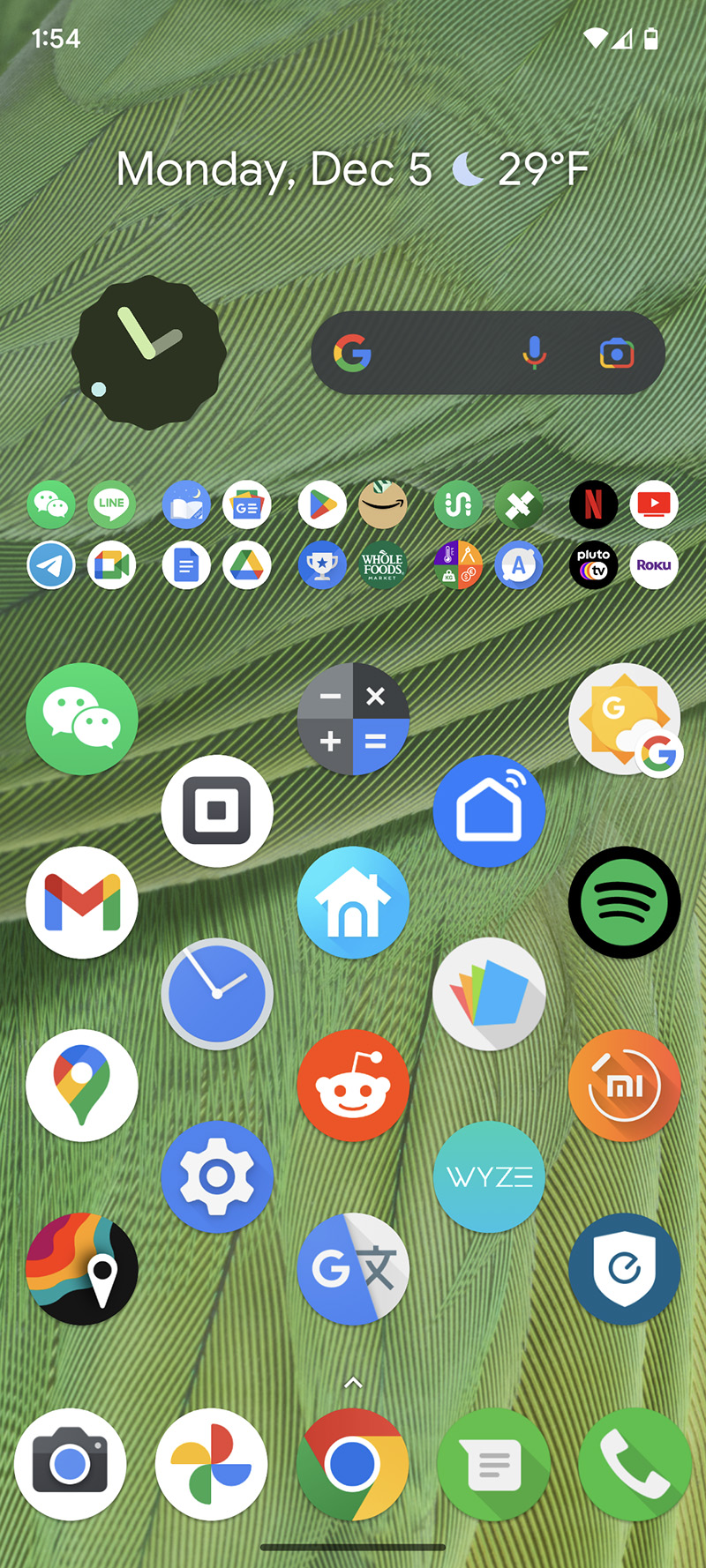 i tweaked my pixel 7 layout a little bit. i discovered android 12's analog clock widget (which i've seen in some google pixel phone ads) and decided to add one to my homescreen by shrinking the width of the search bar. i also got rid of my previous weather widget and replaced it with google's own widget - which doesn't display as much info - but will take into account the system's color preference settings and will alternate between day and night mode. finally i rearranged some of the icons so they have more of a diagonal instead of a grid layout.