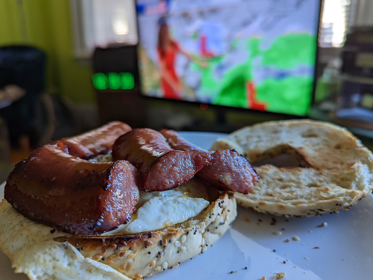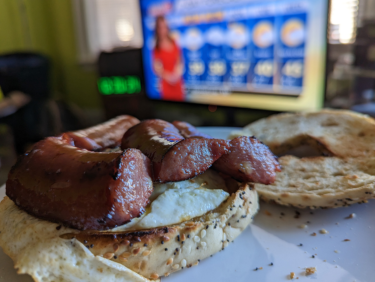 for lunch i made myself another egg kielbasa bagel sandwich.
