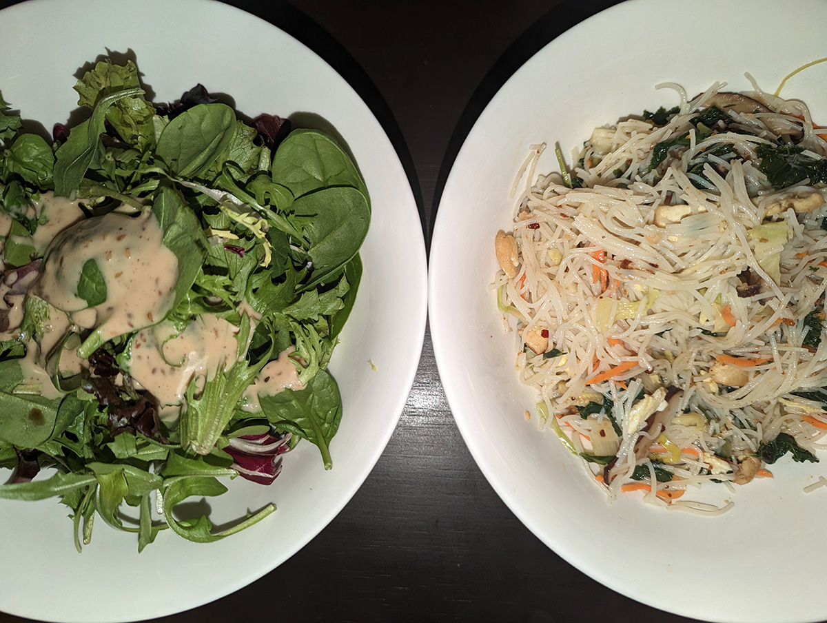 for dinner i reheated the leftover rice noodles, added a teaspoon of chili oil sauce. i also finished some leftover salad greens i had in the fridge, made a simple salad with toasted sesame dressing. i was surprised the greens hadn't gone bad yet.