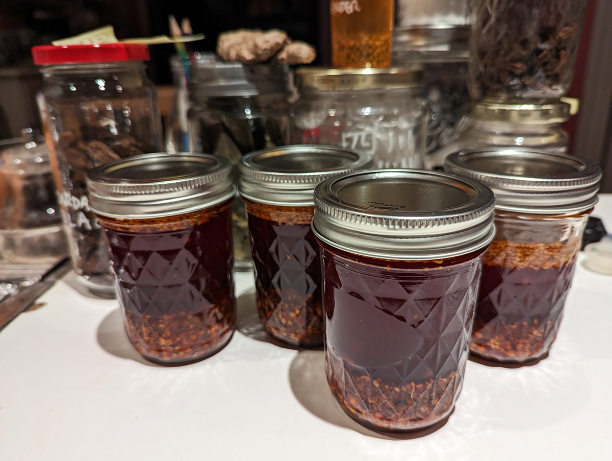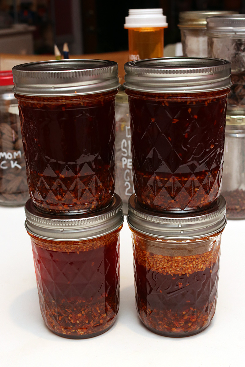 i left the chili oil to cool, adding the sesame seeds i toasted earlier (i forgot to add it beforehand). after a few hours i came back and scooped the oil into half quart mason jars. there was just enough chili oil to fill 3 jars and almost a 4th jar. i tasted some of the leftover oil in the bowl. it was flavorful, but i won't know for certain until i use the chili oil, like a dipping sauce for dumplings. chili oil surprisingly enough is actually not that spicy, not compared to an actual hot sauce.