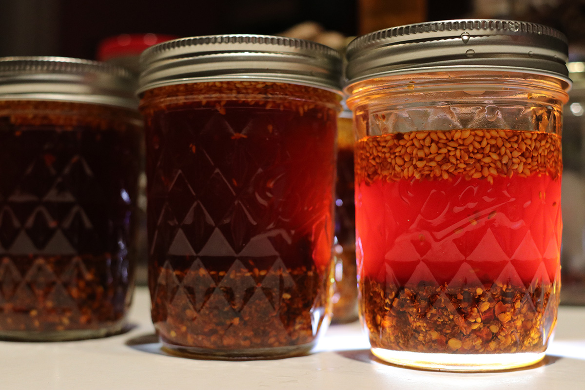| heat fresh ingredients in oil (to prevent splattering). once boiling, add dry ingredients and reduce to simmer at 225-250°F for 1 hour. meanwhile toast sesame seeds in dry pan until golden brown. scoop out ingredients from oil, continue to heat. add pepper flakes, salt, and sesame seeds to heat resistant bowl. once oil climbs to 300°, scoop out a bit to mix with pepper flakes to prevent scorching. pour the remaining oil through a sieve to catch any leftover spices. once chili oil is cool enough to touch, spoon into jars for storage. | |