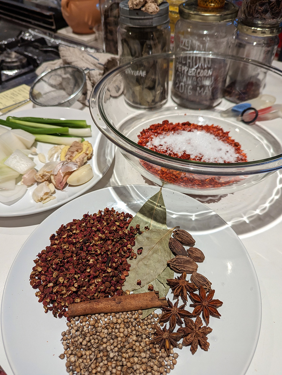 around 3pm i started making my sichuan chili oil, after consulting various online recipes and youtube videos. here's my recipe: