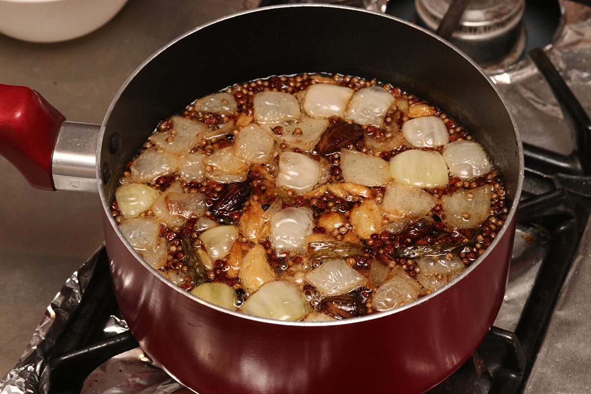 i added the cardamon just because i had it. i wasn't going to add the coriander seeds but saw a recipe that had it so i decided to add it as well. i heated the fresh ingredients in the oil first, to prevent splattering. once it started boiling, i added the remaining dry spice ingredients, then lowered the temperature so it was simmering at 225°F (using an infrared thermometer to take the temperature). i left it simmering for an hour.