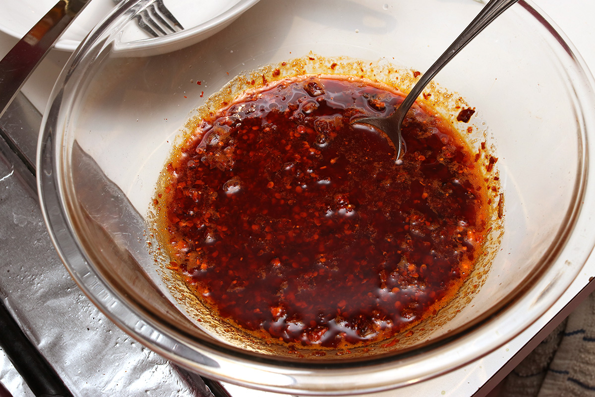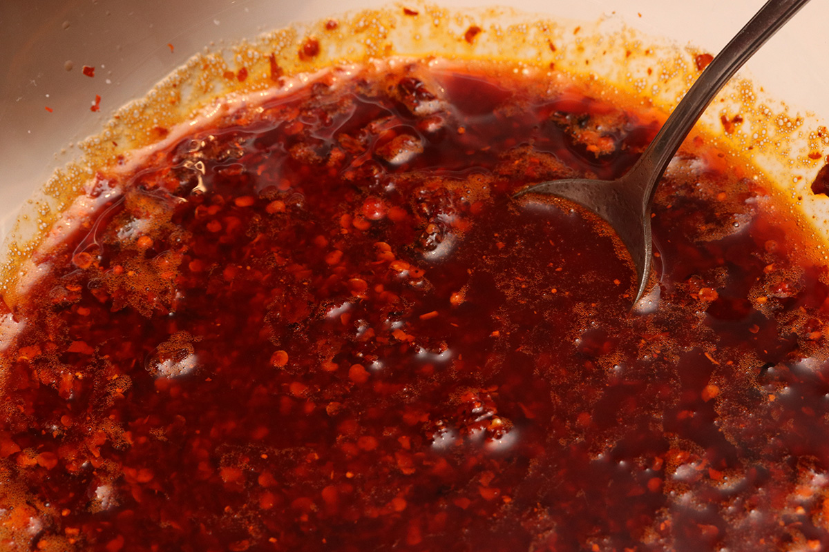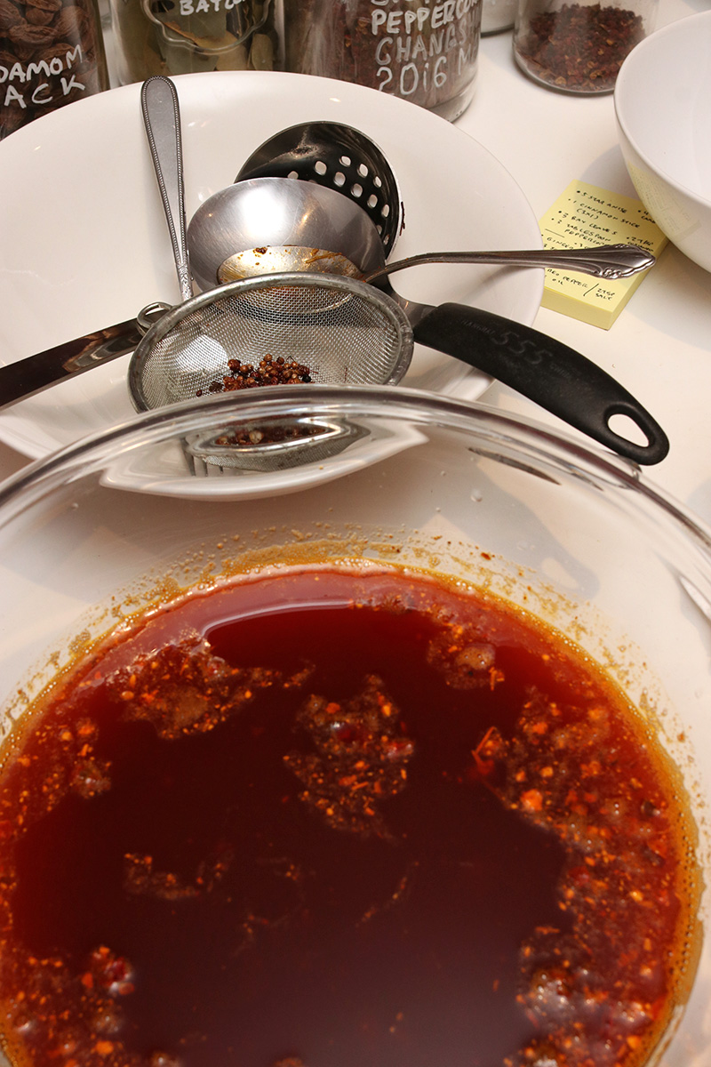 when i came back, i scooped out the vegetables and spices from the oil (as much as i could anyway), then left the oil to continue heating until it reached 300° and i could see a bit of smoke. i then poured about 1/3 of the oil into the chili peppers. i reach that if you "preheat" the peppers, it doesn't scorch. it did fizzle a little bit but not too much. i then poured the rest of the infused oil through a strainer to catch any remaining spice debris. the second pour it didn't fizzle anymore, even though the oil was still plenty hot. i was a little disappointed, if i make chili oil again, next time i'm just going to pour the whole pot of oil all at once to get the maximum fizzle.