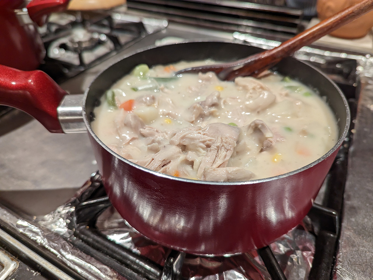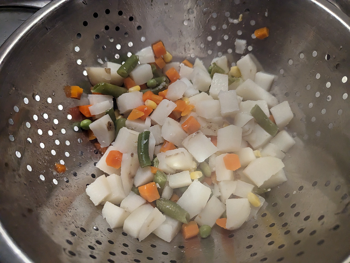 1 lb. chicken breast (approx. 2 breasts), shredded 1 cup frozen vegetables 1 baking potato, peeled, cubed