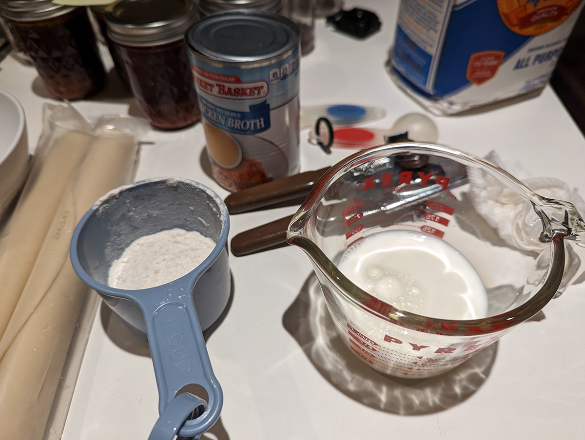 around 7pm i started making my pot pie for dinner. it's actually a pretty easy recipe. i made the mistake of not reading my notes from the last time i made it, so the final result tasted a bit bland because i decided not to add the salt, figuring it was already plenty salty from the melted butter. next time, ADD SALT. it'd also be good to make smaller pot pies instead of one large one, because the interior is pretty gooey, not really designed to be eaten in slices.
