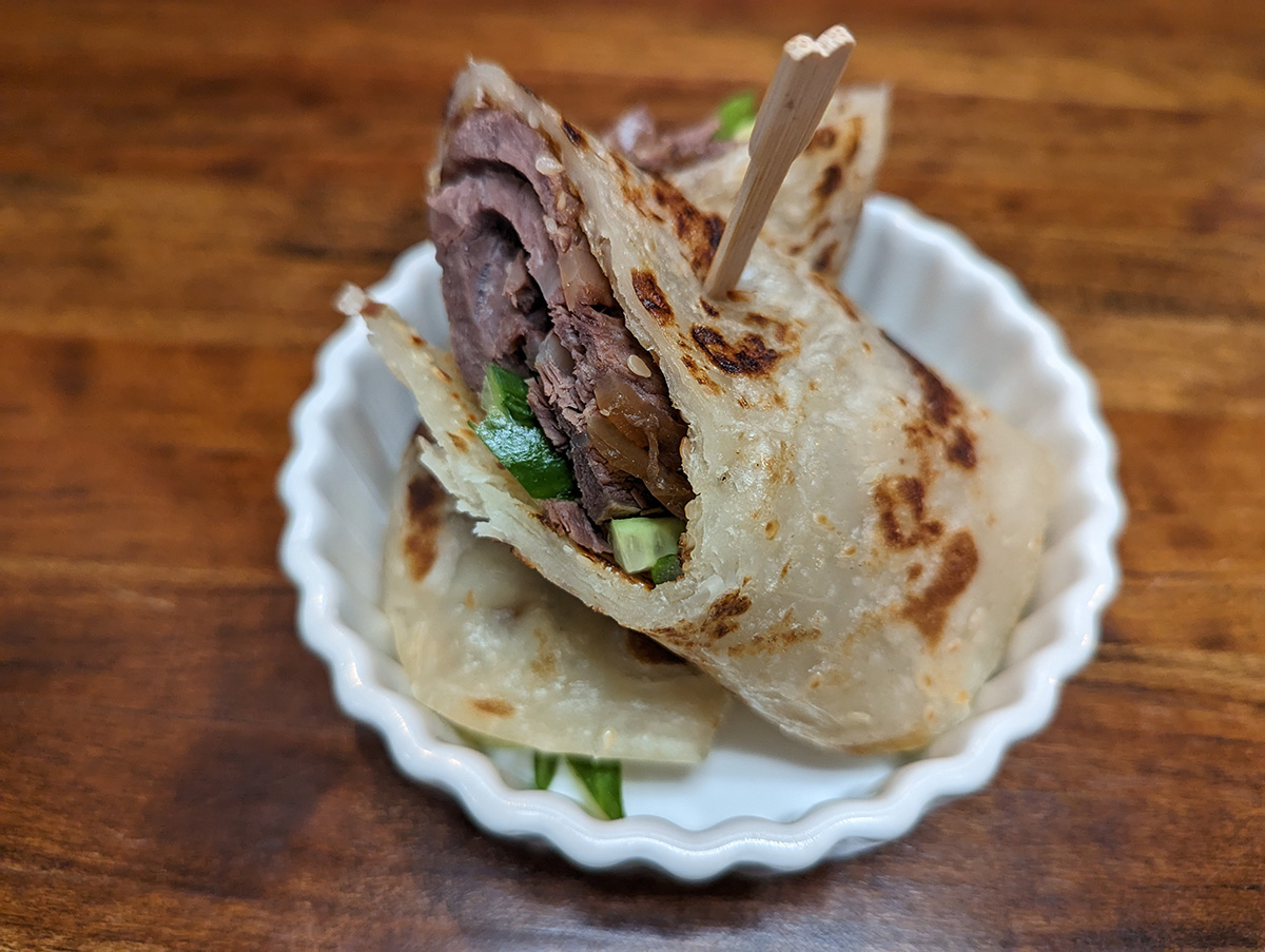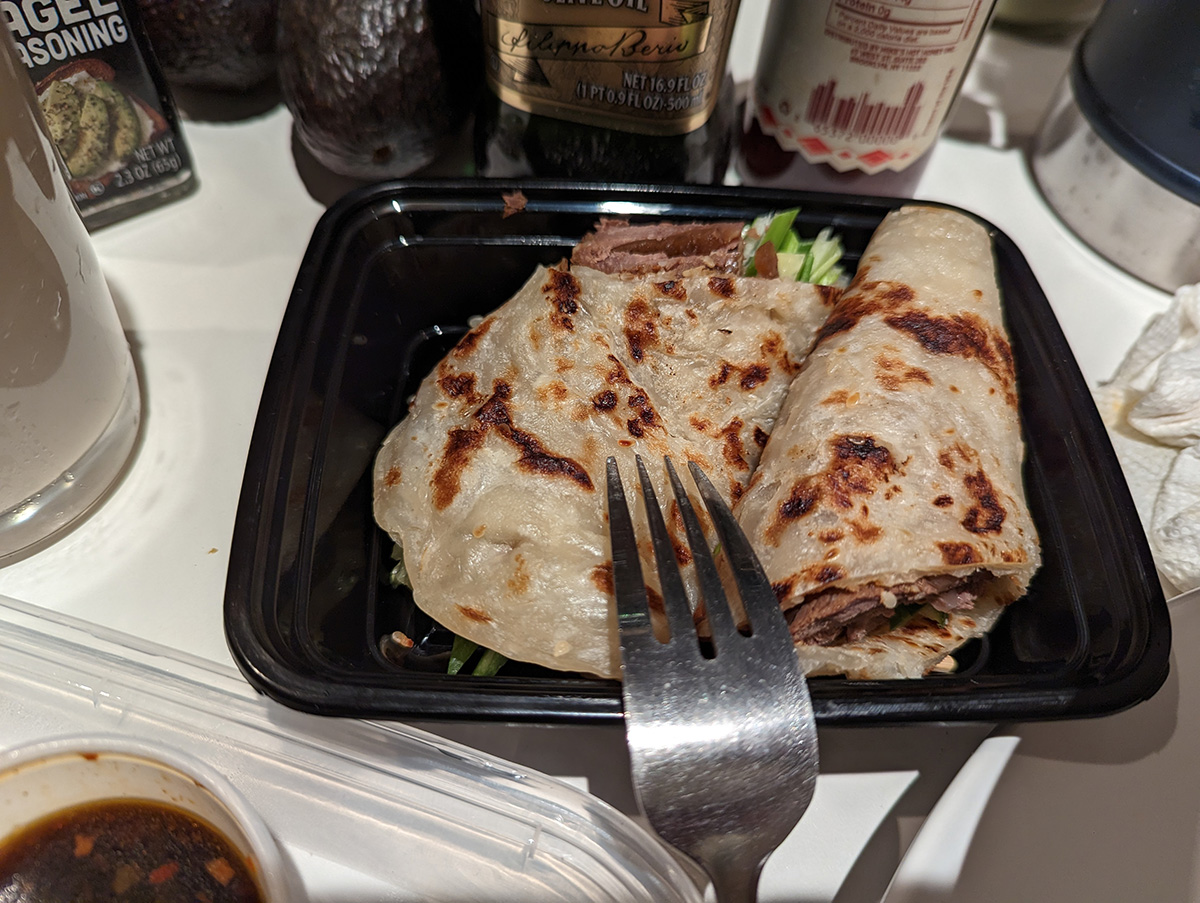 i woke up this morning and left for the cafe via bicycle for my wednesday shift. business today was super slow. must be a combination of people leaving early for the holidays and the fact that all the college kids have gone home for winter break. so my sister had plenty of time to work on her catered meals, yet like always, she left everything until the last minute, and we had to all combine our efforts to help her finish by deadline, when customers were scheduled to arrive and pick up their orders. she made hainan chicken and some kind of scallion pancake beef wrap.