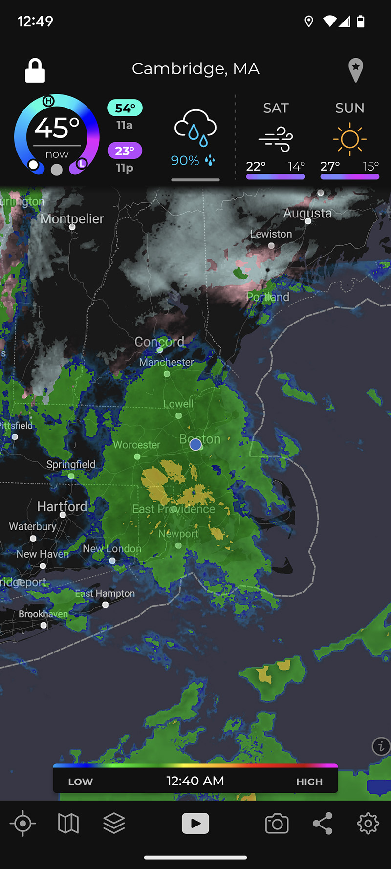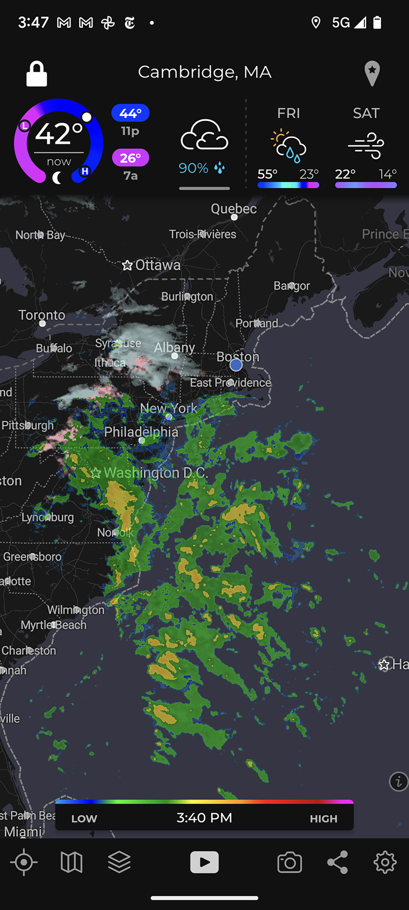 after i stowed the motorcycle in the garage, i went to catch the 73 bus to harvard square. i didn't bring a bag with me, so it felt a little weird just walking around not having to carry anything. the doppler radar showed the rain was about to arrive, maybe an hour or so. the bus arrived a few minutes after i got to the stop.