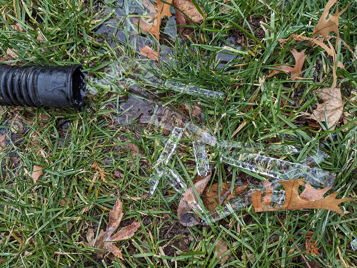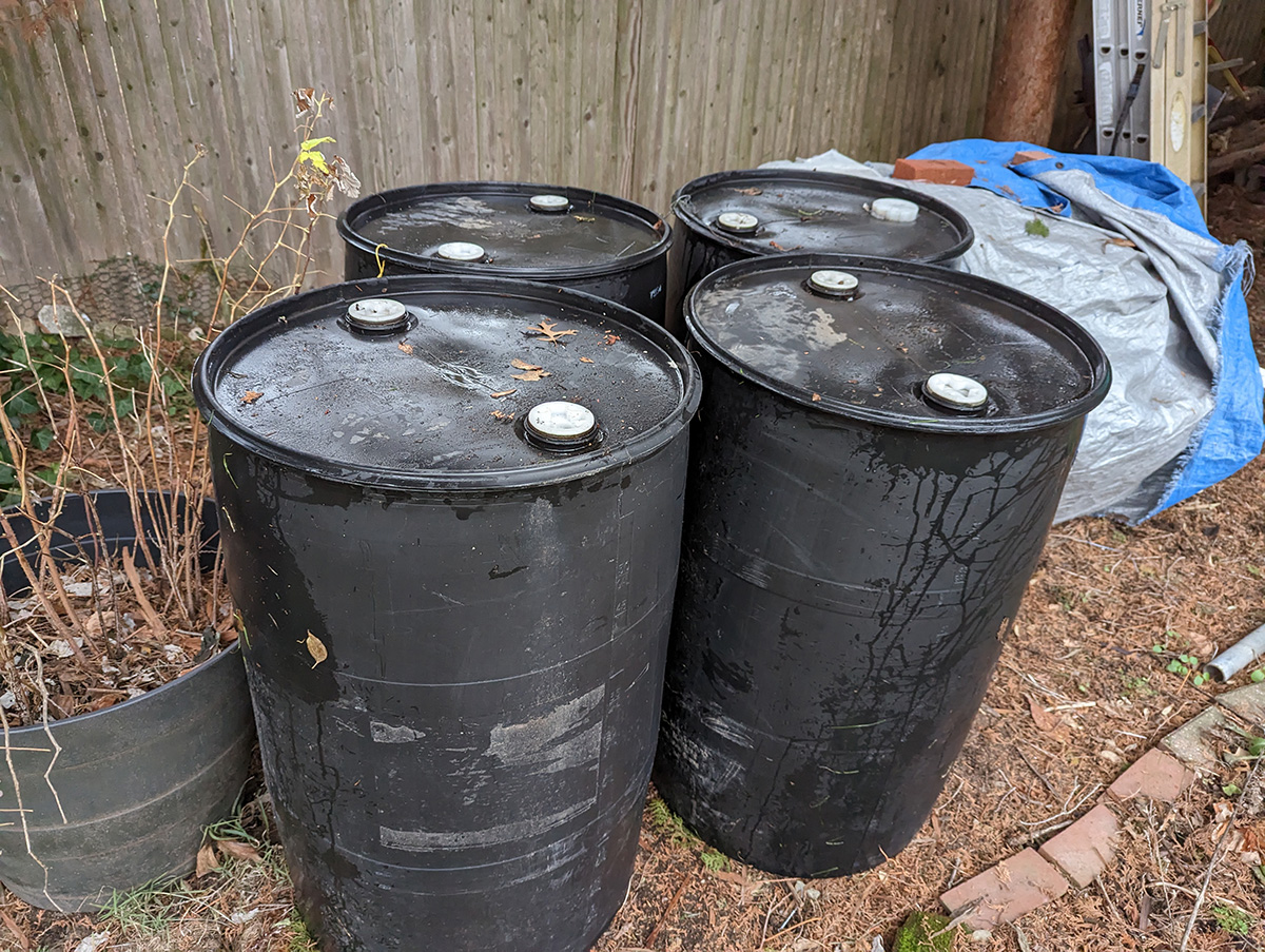 the other thing i had to do was completely disassemble the rain barrels. we'd already shut it down for the season, disconnecting the hoses and bringing in the on-demand pump. but there was still water in the barrels, and the red catch barrels continued to collect rain, it just wasn't distributing it to the storage barrels. i first had to drain the catch barrels, which were all full of water. water, and a layer of ice on the top. while that was happening, i reconnected the down spouts so it'd drain underground. draining the barrels was a challenge, since i couldn't just simply let all the water out; i had to make sure the water was being funneled further away through the use of black sump pump hoses. afterwards i used the catch barrels as storage for the various down spout connectors and hoses.