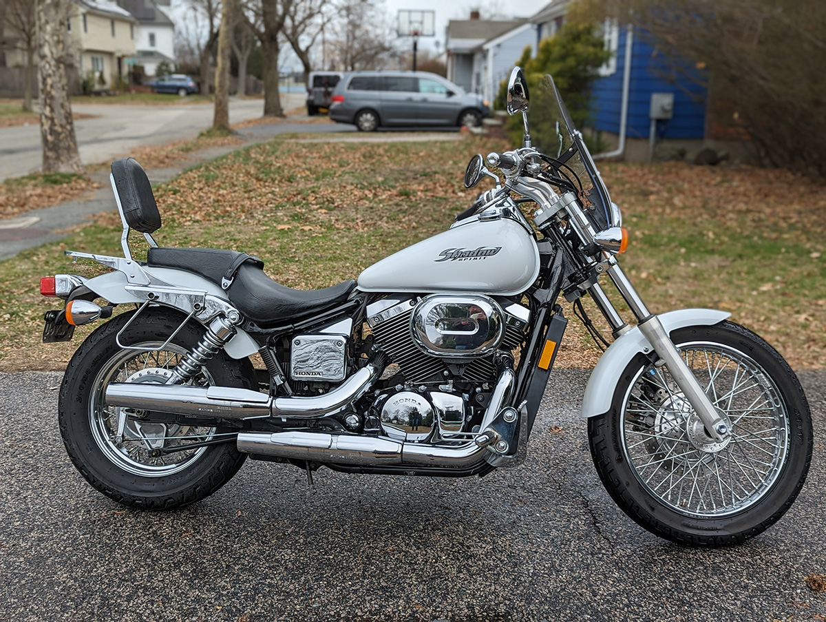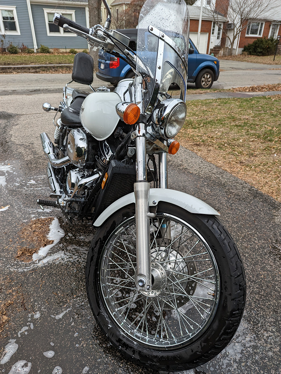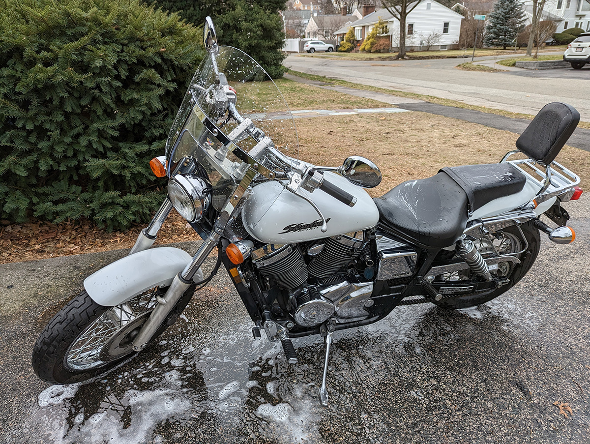 i had some errands to run before the torrential rainstorm arrived this evening, all taking place in belmont. i skipped lunch - thinking it'd be a quick trip - and took the motorcycle to my parents' place. today seemed like the last warm day for a while - if you can call temperature barely in the 40's warm - and i wanted to wash my motorcycle, regardless if i continue to ride or put it in storage. i didn't want to use the hose (even though it was still on, just protected by a faucet cover) so i did it all with buckets: a bucket of soapy car wash mix, and two buckets of ice cold water collected from the rain barrels. i took off my winter jacket even though it was cold - it was just too cumbersome to work in. i had on my merino wool sweater but it was cool enough that i could see my breath while i worked. after i finished washing and rinsing, i dried the bike and left it in the driveway.