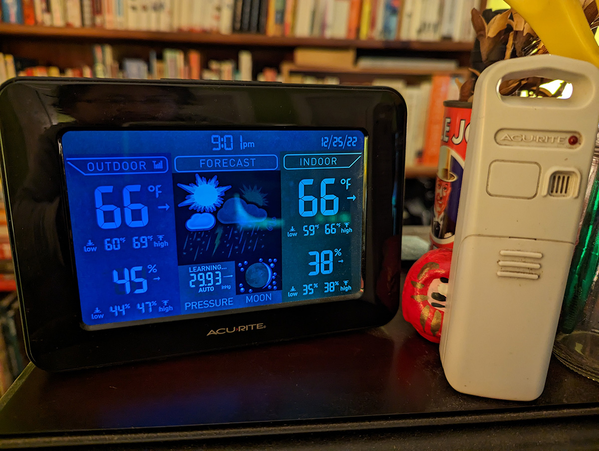 i checked out my acurite remote temperature/humidity sensor. i replaced the batteries, but the temperature and humidity were both still wrong (they should in theory match the numbers from the indoor weather station). the manual said it might take as long as 5 minutes to completely sync up so i left the sensor indoors to let it calibrate.
