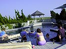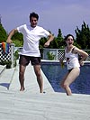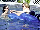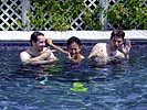while the boys stripped down to our swimming trunks and jumped into the pool (megan read discreetly off to the side). i had brought my flippers, the pool a little safer swimming wise versus the 103 feet depth of loch walden. when the ladies came back it was their turn to get into the pool. deanna's friend erin arrived during that time as well, erin a school teacher in real life.