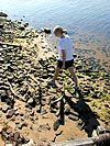 i woke up to sunshine and a peek of blue sky outside the window. i got up before dan and mark and left the cabin for the house where there was already activity.  some of the ladies (andie, mandy) had just gotten back from a run, and people were just starting to venture out into the sun. christine had just arrived, and john's friend lionel soon showed up as well. i went with mandy to explore the shoreline of the property, where this year's new addition was a wooden deck where once there was nothing more than tall reed grass.  we saw a live horseshoe crab the size of a large frying pan retreat deeper into the water when we approached. below the wooden deck was a waterfront lines with seaweed covered ocean rocks and man-made bricks, the smell of sea rot and clouds of salt water flies.  mandy thought about going into the water for a swim, and without hesitation hopped off of the deck and onto the rocks to further investigate. i reluctantly followed only so i wouldn't appear too cowardly, but i had serious reservations about the cleanliness of this rocky beach. on some slanted beams of wood were lined several more horseshoe crabs, dead and dried up ones.