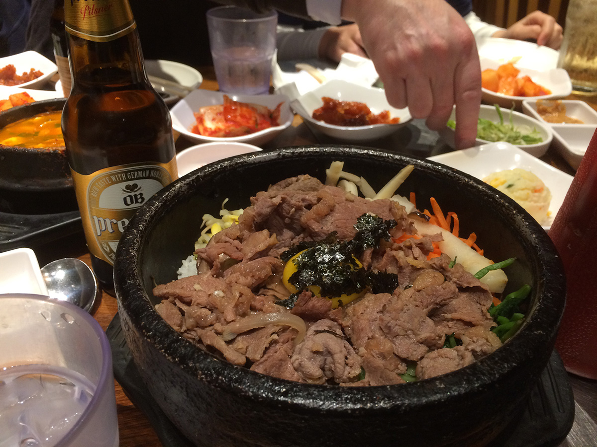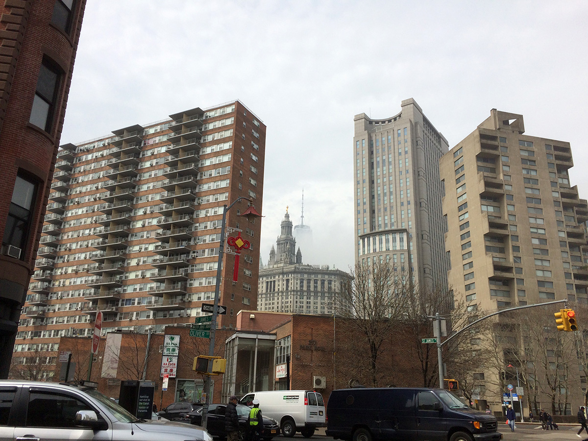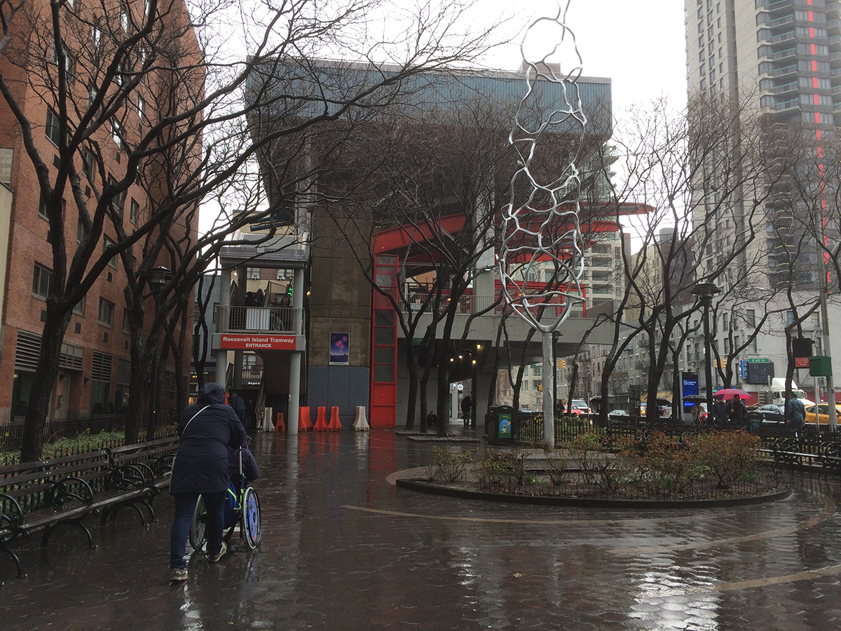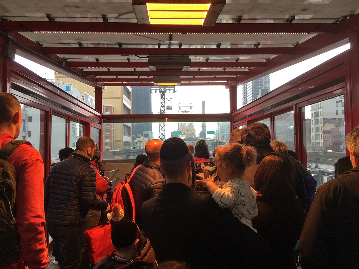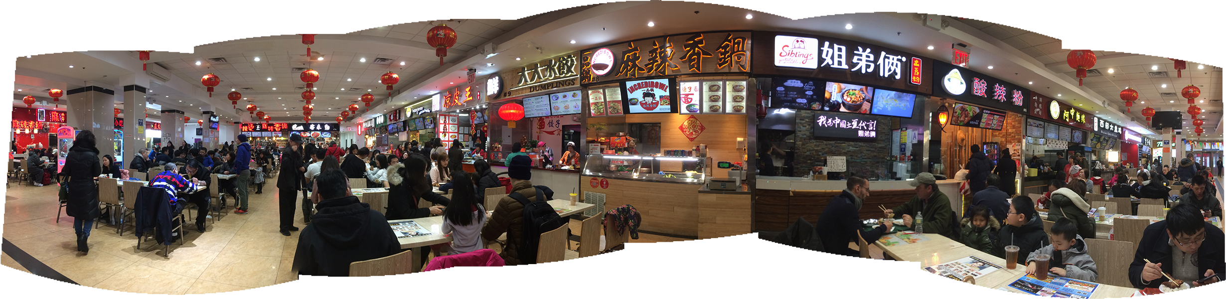 when we got out at flushing it'd started to rain a little bit already. this was in the forecast and something i knew about. but i was the only the person with an umbrella, everyone else putting their confidence in their rain-resistant jackets. i ended up giving the umbrella to hans to use in his wheelchair. another thing i'd forgotten about flushing is how close it is to the la guardia airport. every few minutes a main would roar overhead, close enough to see passengers through the windows if it weren't for all the clouds. in the cold rain, the time it took us to walk 500 meters seemed like forever, but eventually we arrived at the new york food court by 1pm.