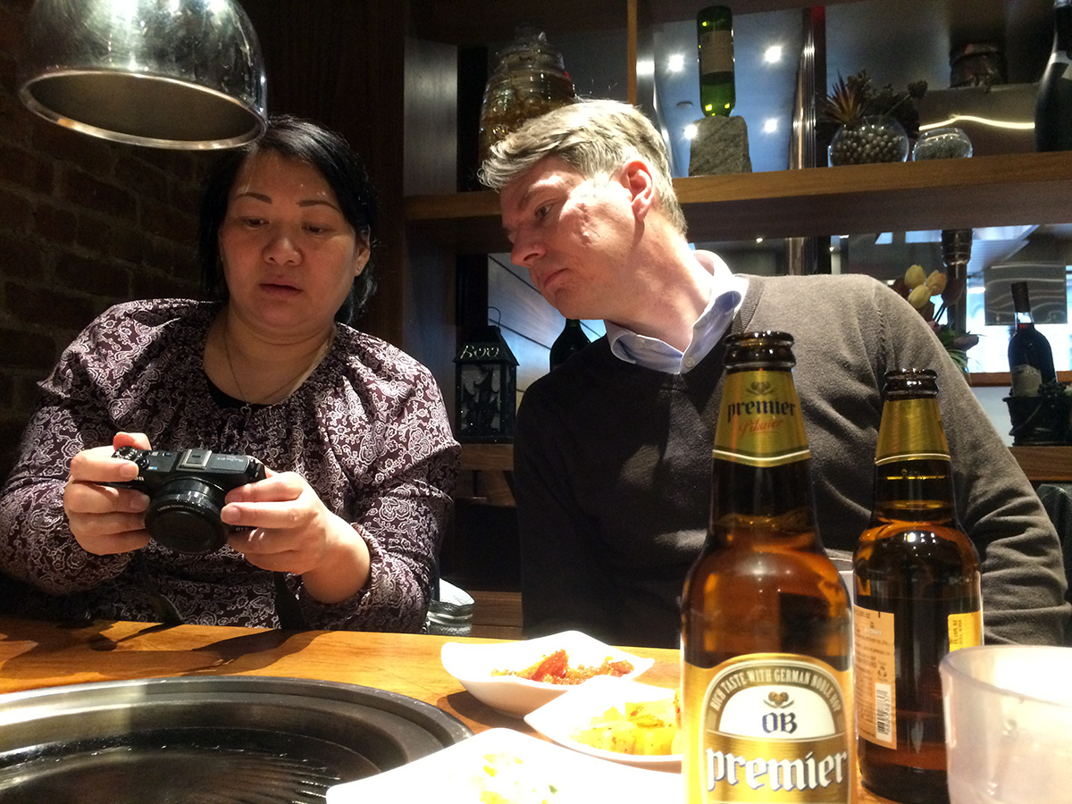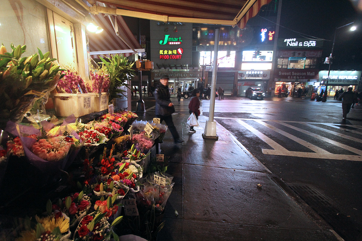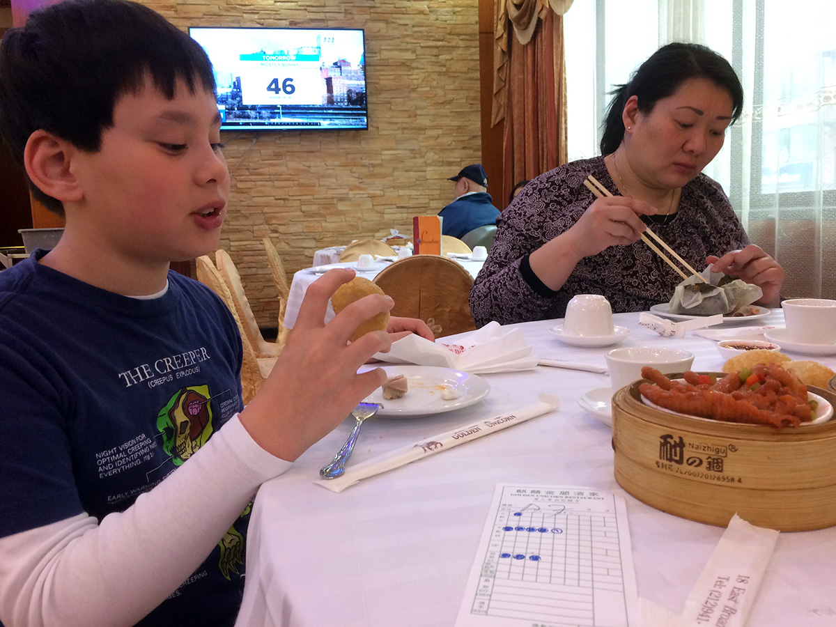 we left the mall with the plan of maybe finding an ice cream shop for the kids while the adults could chat. we passed a few pastry shops, but nothing fit what we wanted. google map search told of a potential place, 10below ice cream in queens crossing (136-17 39th avenue), so we headed there. unfortunately there was also no ice cream to be had, but there was decent seating at a paris baguette (a pastry/coffee shop) so frances sat down while fredrik went with the kids to check out some of the cakes. as for me, i went exploring. queens crossing also contains a small food court: kung fu tea, lao jie food, ajisen ramen, a poke shop, a korean shop, and a few others. just smelling all that delicious food made me hungry again (by then it was close to 6pm). there is so many restaurants and food places in flushing it's a foodie paradise, but to find the good ones require advanced research; i'd love to spend a whole week here just to discover all the best restaurants. frances decided to get some meat buns to go; i was tempted to grab something as well, but planned on returning to new york food court later tonight for dinner, so i held off. i did buy a set of chopsticks at banzai japanese gifts for $3.27. when i returned to the cafe i found frances chatting with an old lady. later frances told me that maybe she was trying to get her to buy stuff because she gave frances her business card.
