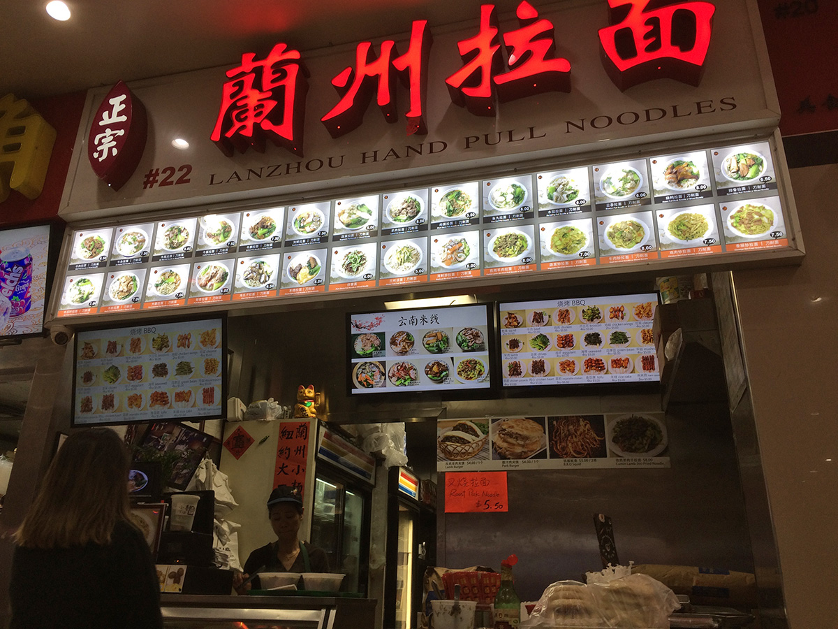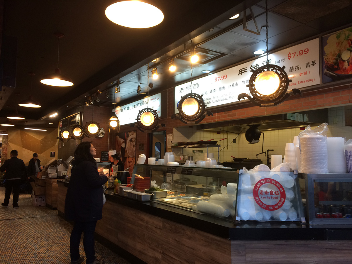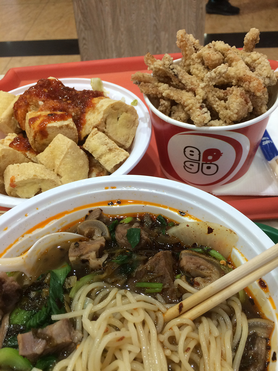 i finally arrived at new york food court by 8:16pm. it wasn't as crowded as earlier. i wanted to try someplace else besides the taiwanese place (which i will revisit as well), so i made a tour of all the shops but was just overwhelmed with the selection. i finally settled on a bowl of lanzhou hand-pulled noodles with lamb ($8). while that order was being made, i went tot the taiwanese place and ordered a bowl of smelly tofu (炸臭豆腐 $6.50) and some fried squids (盐酥花枝 $6.50). when my noodle was ready, i moved to a table that was closer to the taiwanese shop so i could grab my order when it was ready. i also had a craving for bubble ice tea, but i couldn't manage to wait for my order, keep an eye on my things, and also visit the ice tea place, so i decided not to get it. the challenge of eating by yourself: nobody to watch your stuff! when everything arrived, i took my photos and sat back to enjoy my dinner. the noodles was good, but unfortunately filling as well. i realized that too late, and didn't finish the rest of the noodles so i could concentrate on the tofu. by that point my stomach was already near capacity. i could only eat half the tofu, and had to toss the rest. the fried squids i got a bag and took it back to the hotel with me. too much delicious food, only one stomach! i looked forward to returning to the hotel, where i could finally relax, take another hot shower, watch some tv, then sleep.
