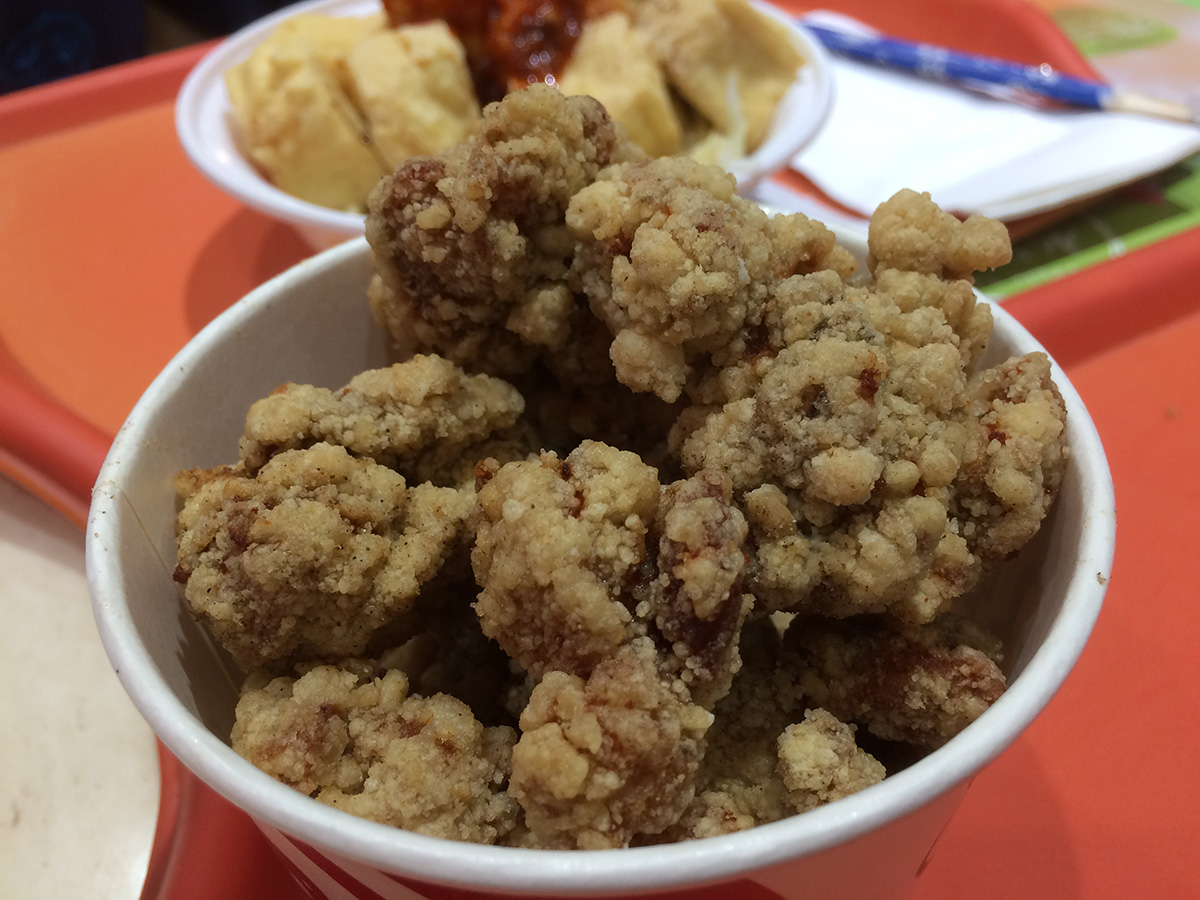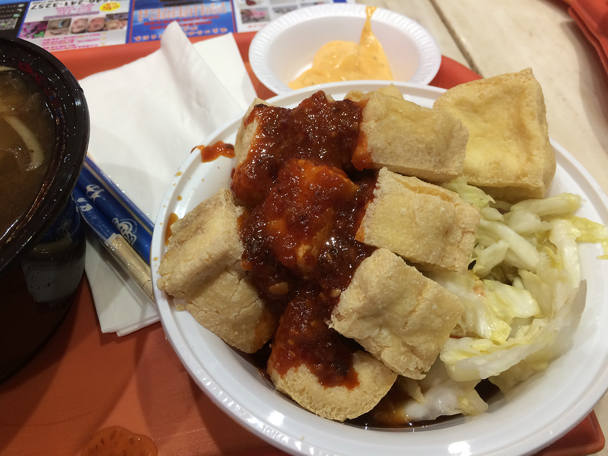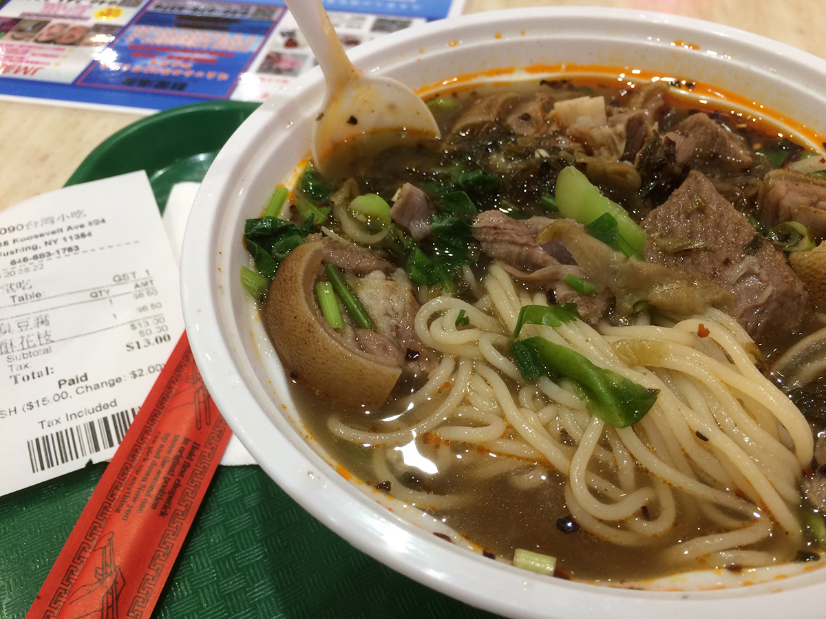 i discovered new york food court last april when i was in the city rendezvousing with another visiting international friend, wangyang. it's been almost a year and i've been meaning to return to 8090台湾小吃 get some authentic taiwanese food. my visit today was more for me, but frances and her family seemed to be game. in fact, the whole reason why i picked a flushing hotel was so i could be closer to this food court! after we found a table (the place was surprisingly crowded for a weekday afternoon), i went to the only taiwanese shop and ordered: squid nugget soup (花枝羹类面 $7.50), smelly tofu (炸臭豆腐 $6.50), and fried chicken nuggets (盐酥鸡 $6, this was actually a mistake, i wanted the fried squids instead), a total of $20 well spent.1 frances got an order of smelly tofu as well as a bowl of beef noodle soup. fredrik went around searching for something else to try, though he was most likely overwhelmed by the sheer selection. i should've gone with him to narrow his selection, but i was so hungry at that point (to the point of either passing out or being hangry) that i started eating right away once i got my order.
